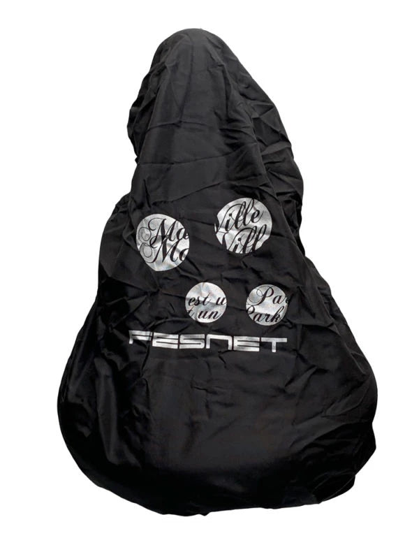 Matiere étanche, respirante et déperlante Protection de selle fesnet • Système de fixation à poste antivol • Sécurité motifs réfléchissants • Protège de la pluie et de la pollution • Rangement sous la selle facile par velcro Modèle noir